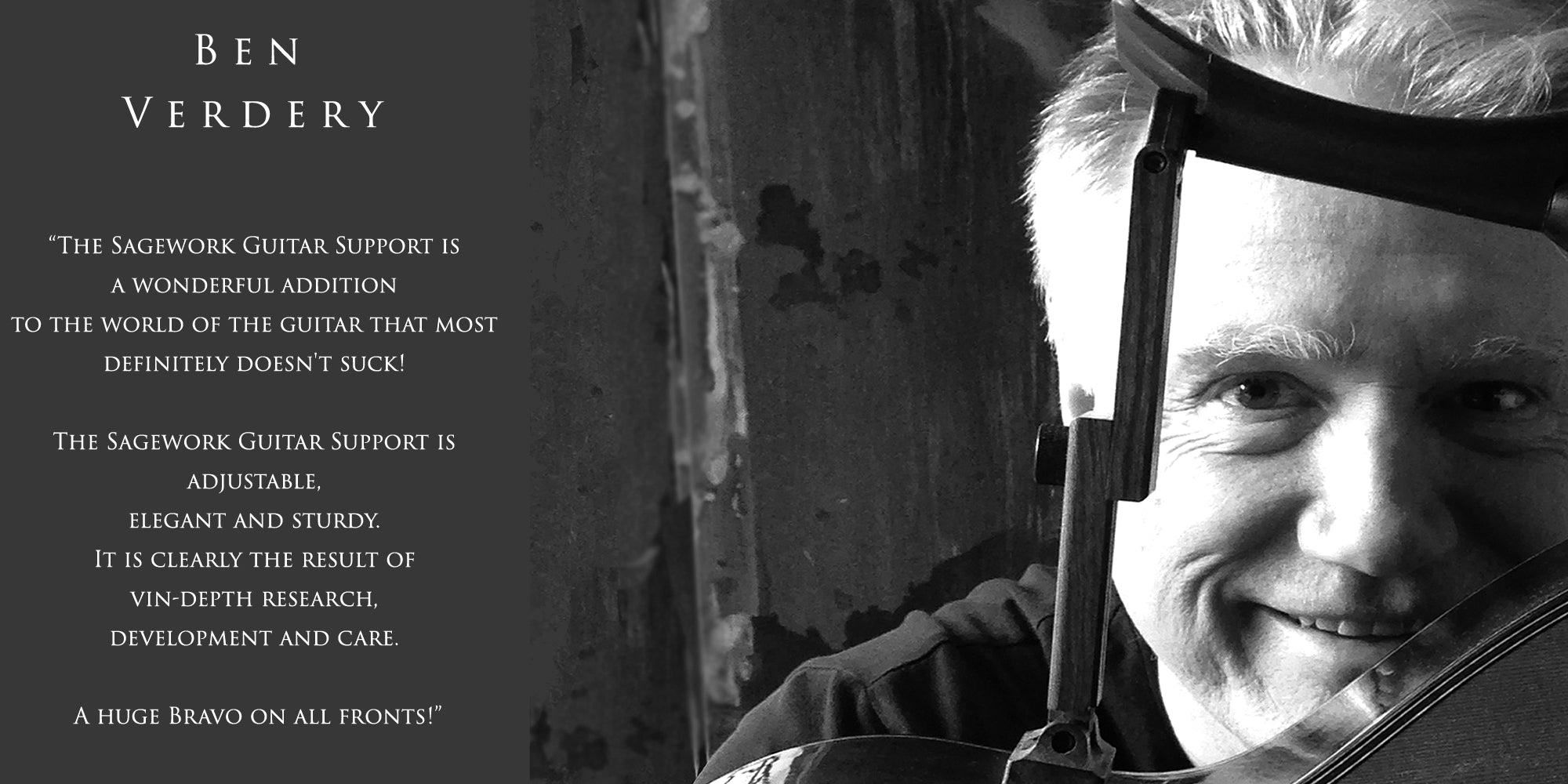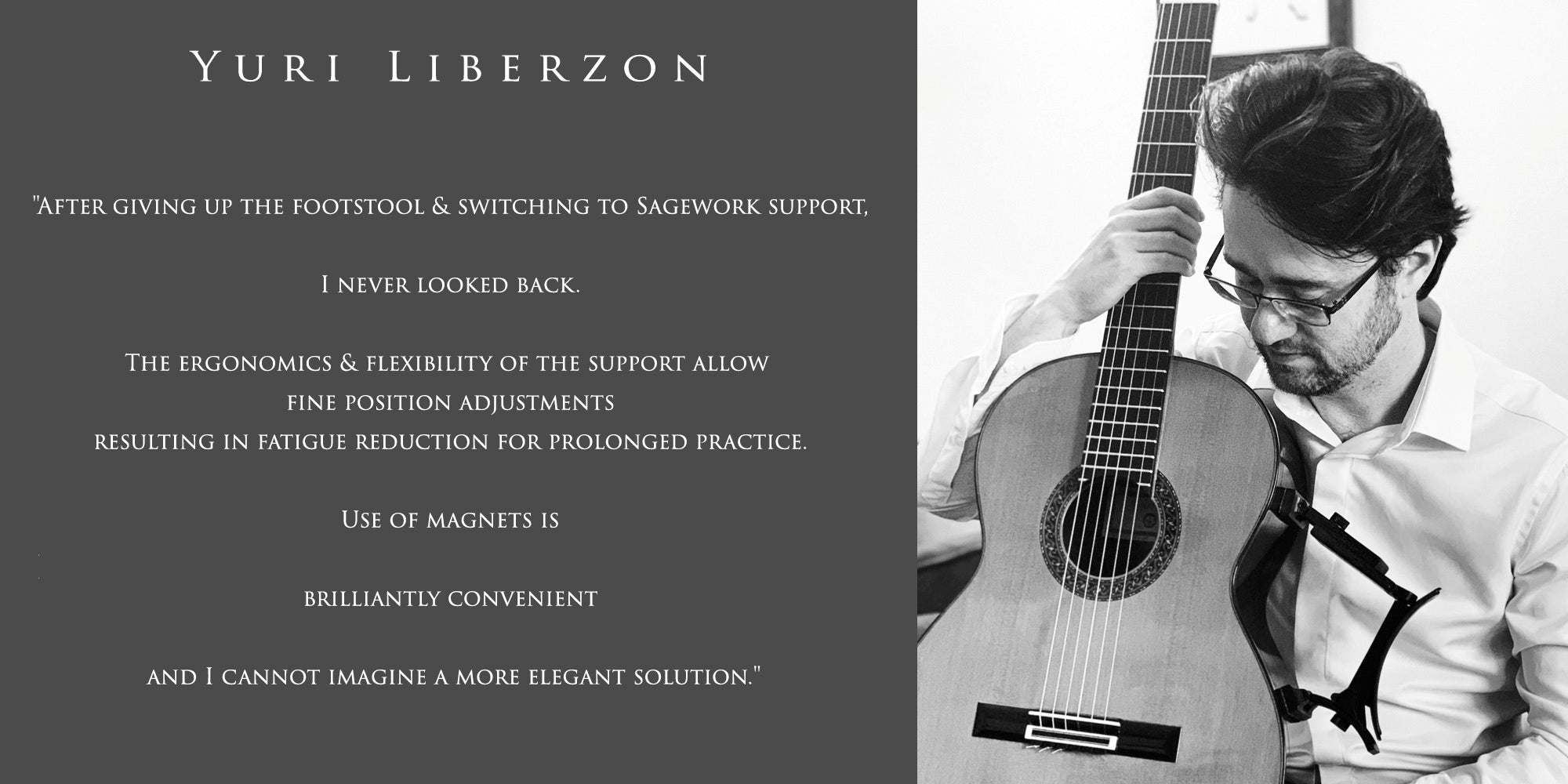 "With the brilliant idea of affixing the support with rare-earth magnets from inside the guitar, the Sagework Support feels as if it’s screwed in! It’s easily removable, and it always goes back the the exact same spot when it’s put on. Finally, the unit folds into a small package, and fits easily in the storage area in my case. I believe that this is the most intelligently designed, aesthetically pleasing, rock-solid and ergonomic support available today. The night after I installed it, I used it concert with LAGQ."